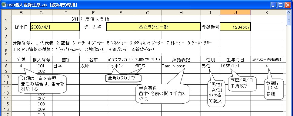 昨年度からスクールの指導者も個人登録をしていただきましたが、20年度より日本協会の通達により高校生以上のラグビーに関わる者は、代表者・監督等も個人登録をしていただき、一人1,500円を納めていただくことになりましたのでご承知おき下さい。 (中学の指導者も同じ) |